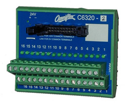 Fastrak Field Terminal Board, 20 way ribbon to terminals - isolated outputs. Switches 10 to 30V dc @ 250mA max per point. Order 20Way Ribbon Cable (C1432-x) separately. DIN Rail Mounting. The C6322A Ribbon to Terminal adapter board is a terminal board designed for Omniflex Ribbon outputs such as from an Omni16 Repeat Relay Ribbon output and converting them to output terminals for maximum input density. The circuits ARE isolated and are typically used with ribbon outputs. They provide outputs with Open Collector (negative common) on terminals. DC power is supplied by the ribbon cable. The C6322A terminal board is fitted onto a quick mount plastic rail for DIN-rail mounting in control panels. |
